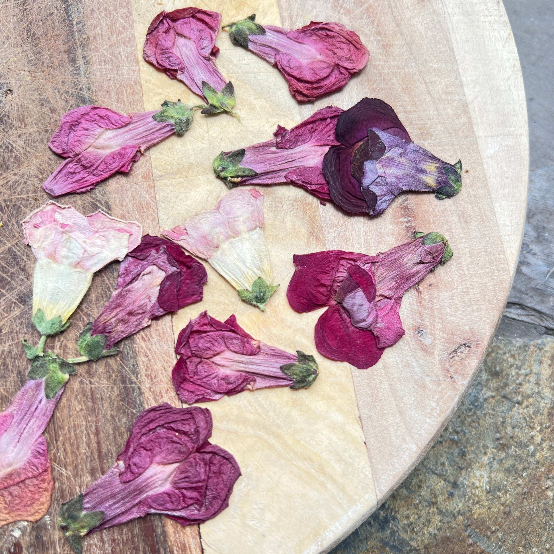 Freshly picked and pressed edible flowers from our field. Grown sustainably in peat free soil. Lovely for decoration on cakes and plates. Our pressed snapdragons are vacuum packed straight after they come out of the press so we cannot offer bespoke colour palettes here but if you have a project in mind that you would like us to press a particular palette for, please get in touch. They are grown in yellows and oranges.